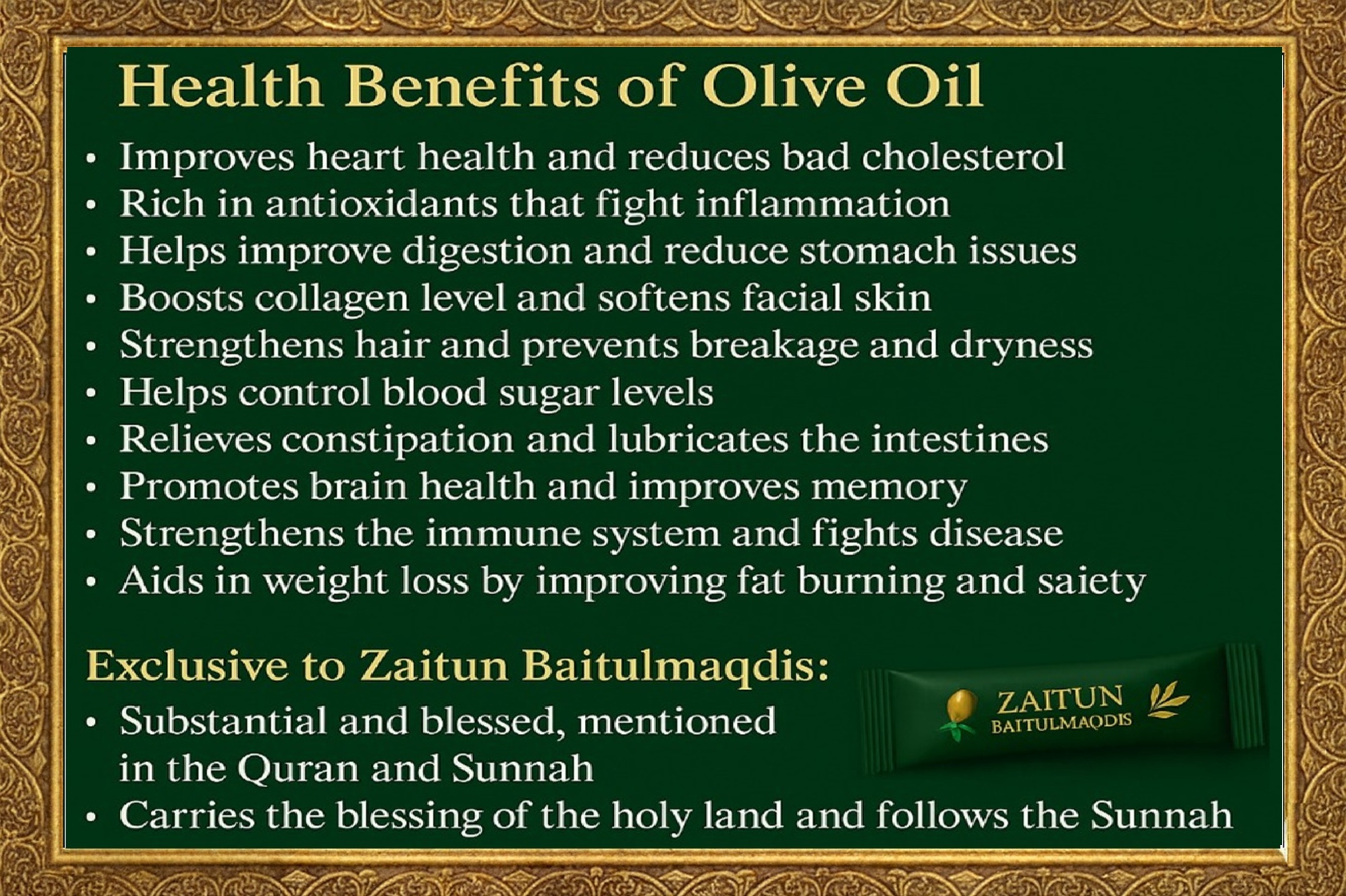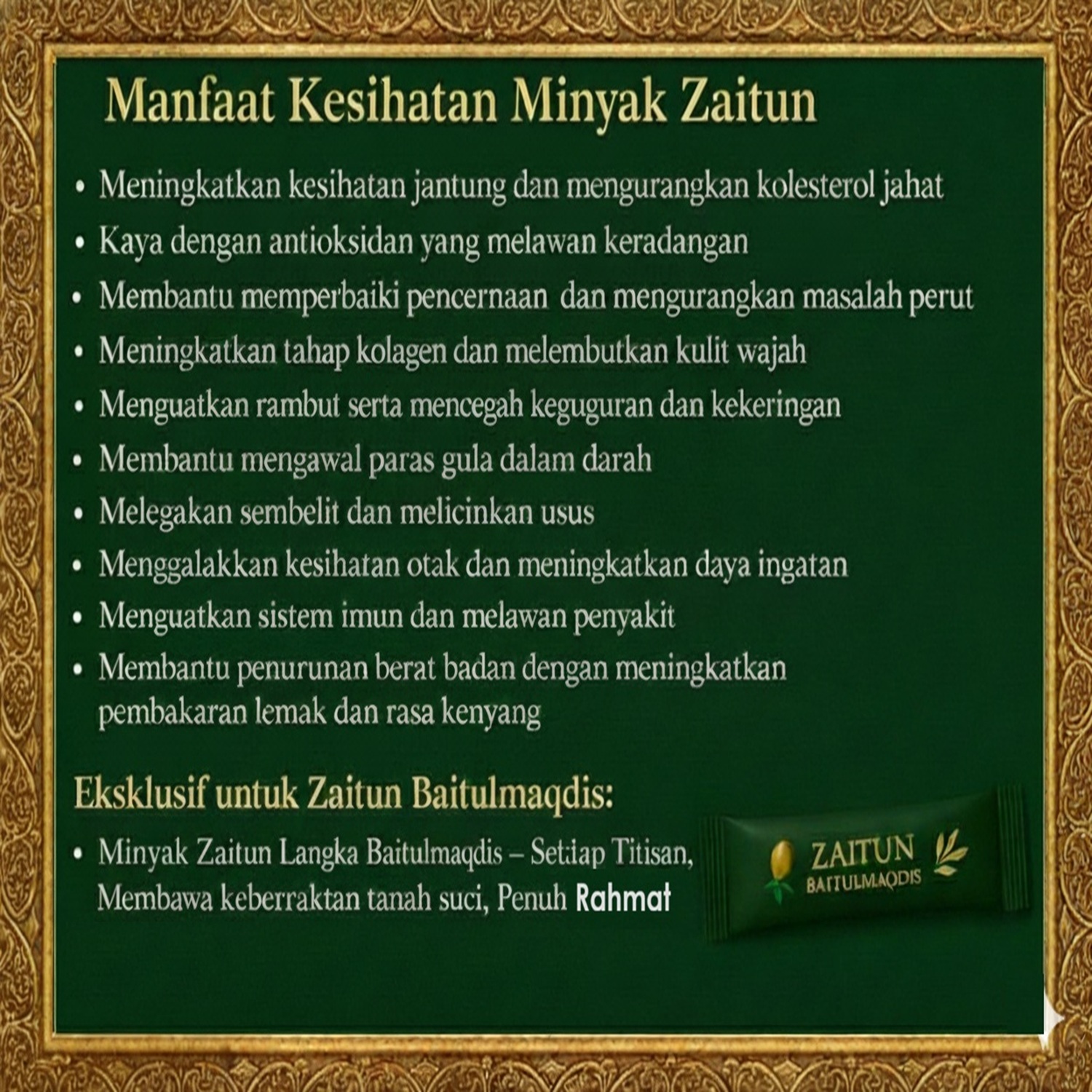 Kami memastikan pemeliharaannya dengan cara yang mengekalkan antioksidan dan vitamin sepenuhnya. Ia lebih daripada sekadar minyak zaitun... ia adalah titisan berkat dari Tanah Suci untuk kesihatan harian anda.