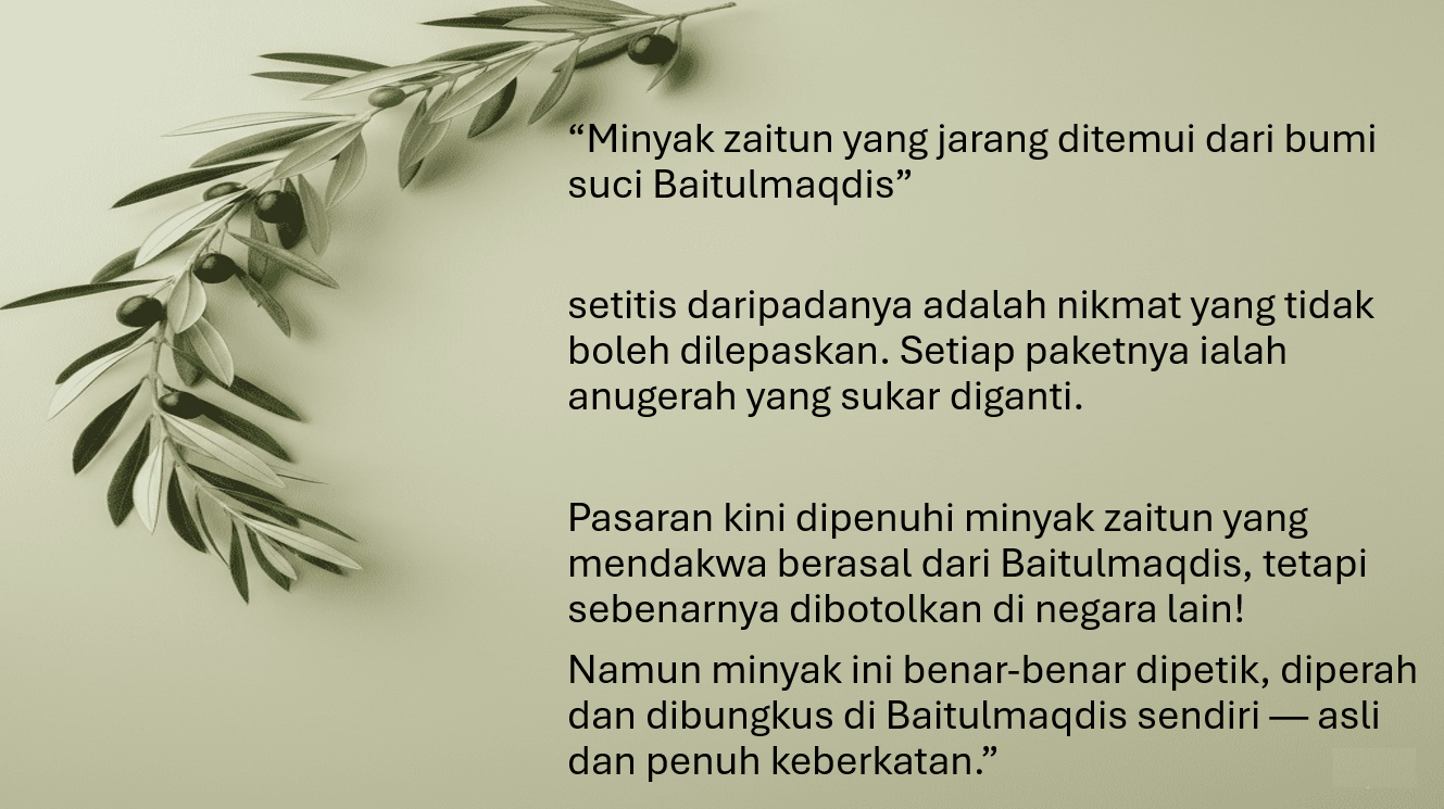 Di Syria, minyak zaitun ada di mana-mana… tetapi minyak Al-Quds ini jarang. Bila kami jumpa, kami pilih terus — lebih suci dan berkat.